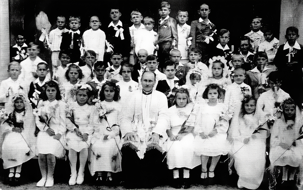Mysłakowice 1949 r. Dzieci po I Komunii św. z ks. Kotulakiem
