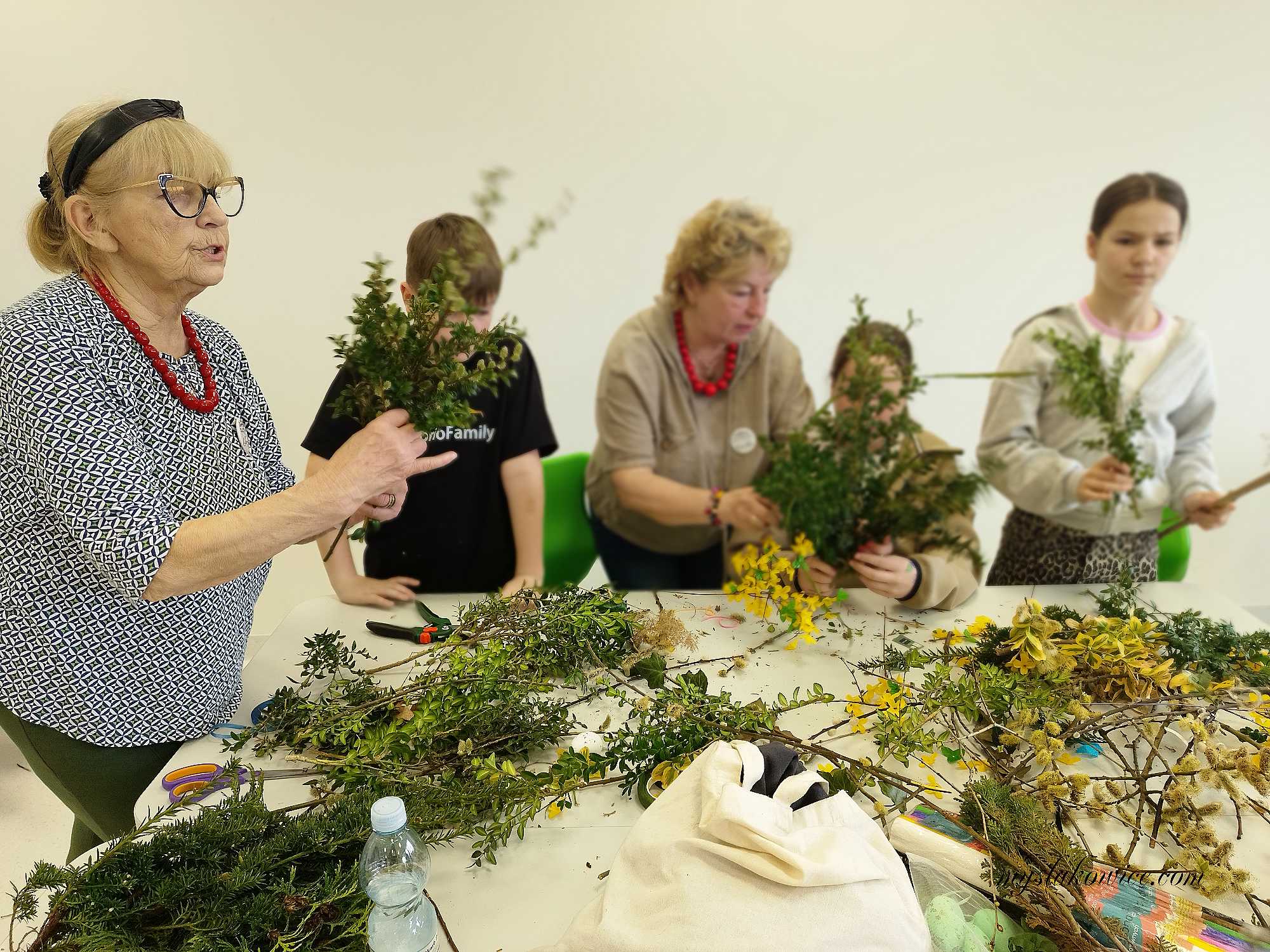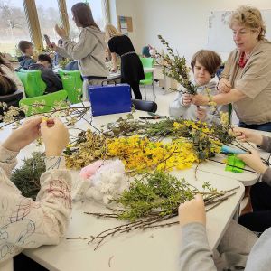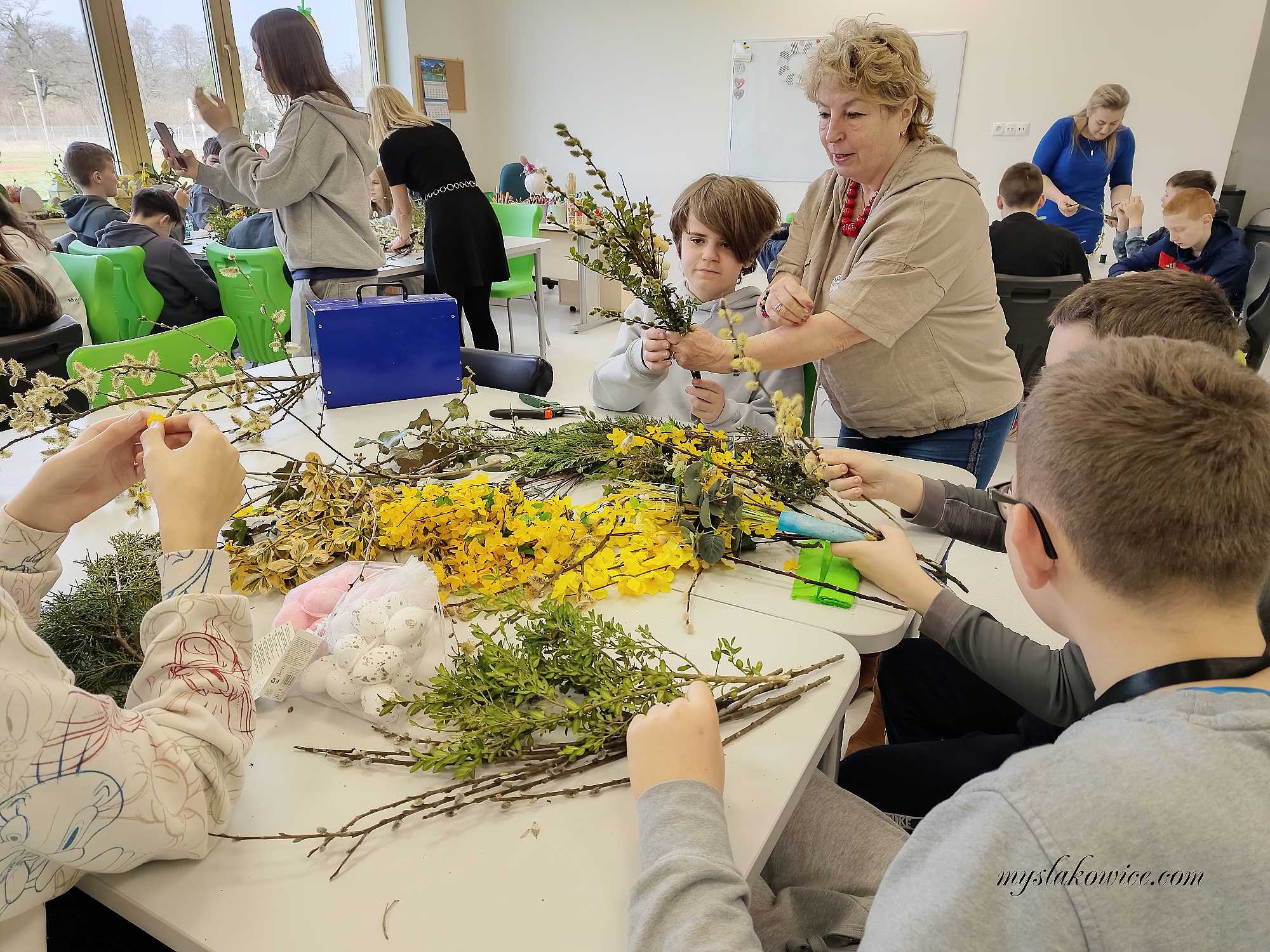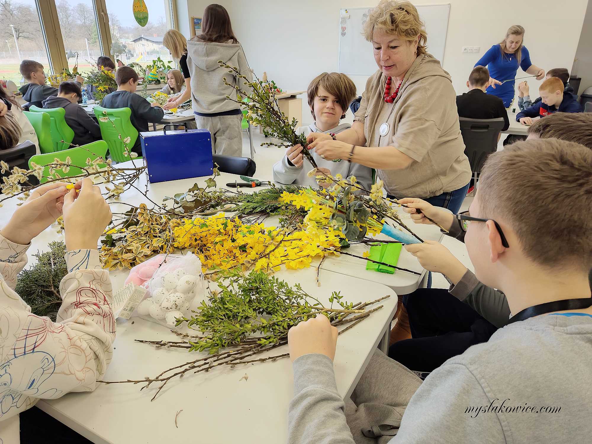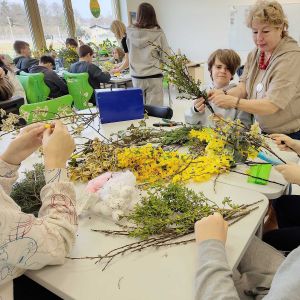 W sali od początku było głośno, ale tak pozytywnie. Stoły zastawione bibułą, suszonymi trawami, gałązkami i wstążkami, a dzieci kręciły się wokół, trochę z ciekawości, trochę z niecierpliwości. Tego dnia Szkoła Podstawowa w Mysłakowicach, razem z sołectwem, zorganizowała warsztaty robienia palm wielkanocnych.